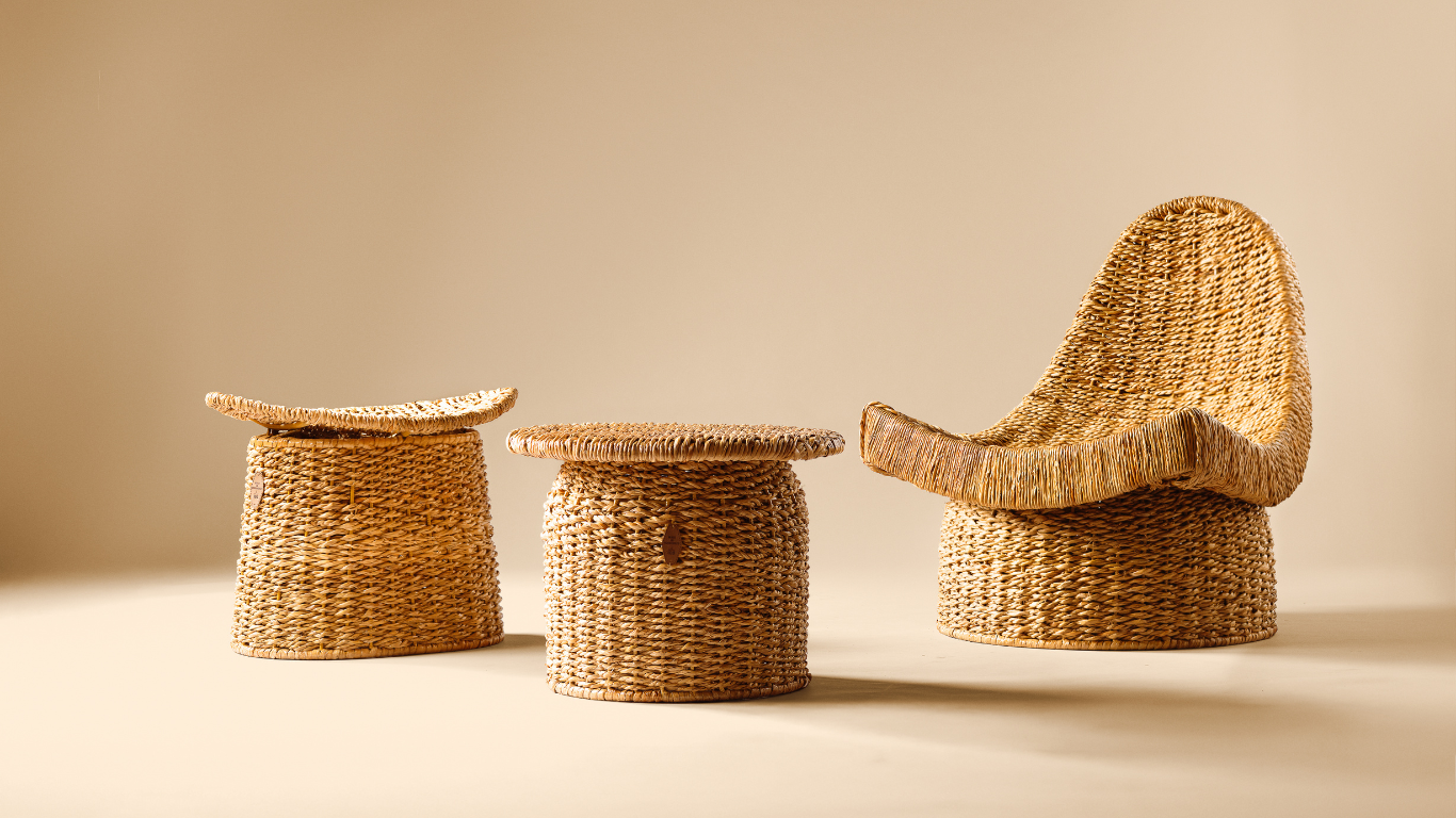 La muestra presenta la colección de piezas “Made in Huanchaco”, creada junto a artesanos locales, que reinterpreta el trabajo ancestral de la totora en diseño contemporáneo.