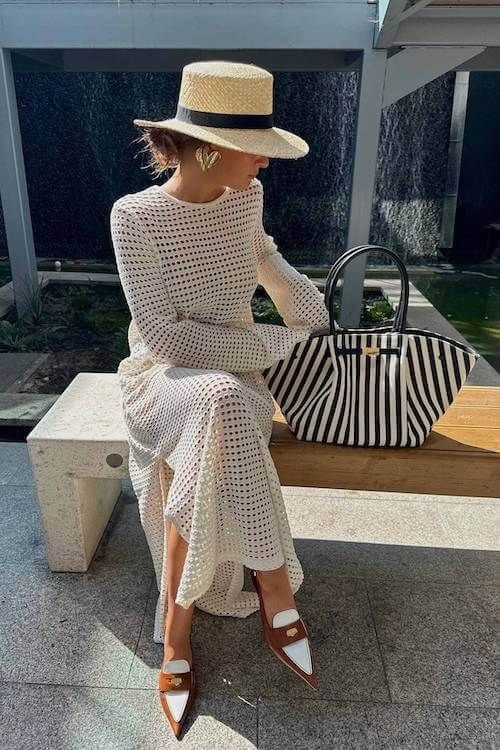 3. El vestido de crochet: un clásico que te salva siempre. Si no es muy transparente, sirve para más ocasiones. Los de manga larga visten más sin dar calor. Cambia accesorios y tendrás diferentes versiones. Úsalo con sandalias de taco para una cena, con sandalias planas para el día o con mocasines si haces turismo. Añade un sombrero para un toque chic.
